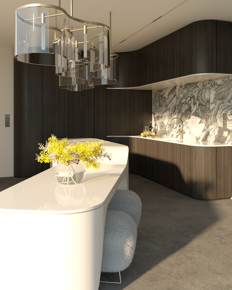 Współczesna kuchnia to nie tylko przestrzeń do przygotowywania posiłków, ale także miejsce spotkań. Tę funkcję wziąłem pod uwagę projektując WSPÓŁCZESNĄ KUCHNIĘ OWALNĄ. Minimalizm kolorystyczny i materiałowy, który przyświeca moim projektom został przełamany przy pomocy owalnych i półokrągłych kształtów mebli kuchennych. Zastosowany do ich wykonania materiał mineralno - akrylowy pozwala na dowolne kształtowanie powierzchni oraz zapewnia tak potrzebną w nowoczesnej kuchni wytrzymałość i antybakteryjność. Przedłużona wyspa kuchenna płynnie przechodząca w stół tworzy idealną przestrzeń do wspólnych spotkań z domownikami i przyjaciółmi. Pozornie surowe wnętrze ozdobiła także zaprojektowana przezemnie szklana lampa o falującym kształcie oraz miękkie, pluszowe taborety. Fornir w kolorze wędzonego dębu nadaje całości klasyczny i ponadczasowy charakter, a także ociepla całe wnętrze.